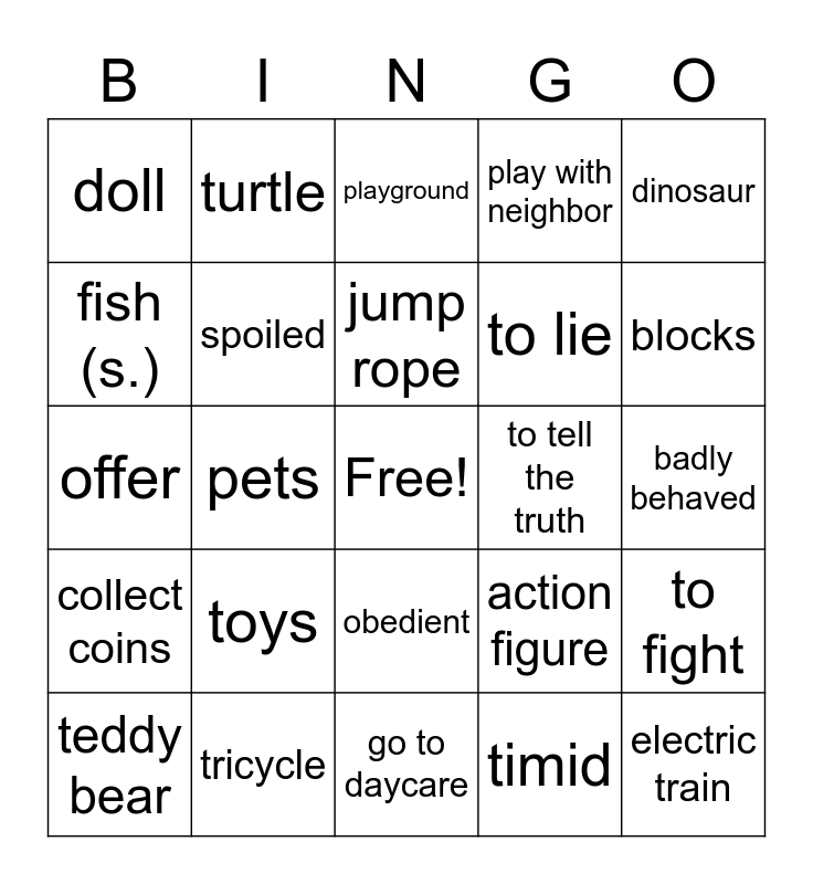 This bingo card has a free space and 24 words: toys, tricycle, jump rope, teddy bear, dinosaur, doll, fish (s.), turtle, to tell the truth, obedient, to lie, offer, action figure, to fight, spoiled, timid, badly behaved, playground, blocks, pets, electric train, collect coins, play with neighbor and go to daycare.