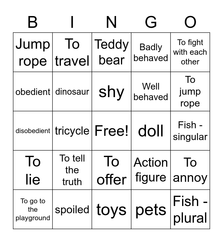 This bingo card has a free space and 31 words: toys, blocks, tricycle, Electric train, Jump rope, Teddy bear, dinosaur, Action figure, doll, pets, Fish - singular, Fish - plural, turtle, To collect coins, To jump rope, To play with the neighbor, To annoy, To tell the truth, To lie, To offer, To fight with each other, To go to daycare, To go to the playground, To travel, Well behaved, obedient, Badly behaved, disobedient, spoiled, shy and mischievous.