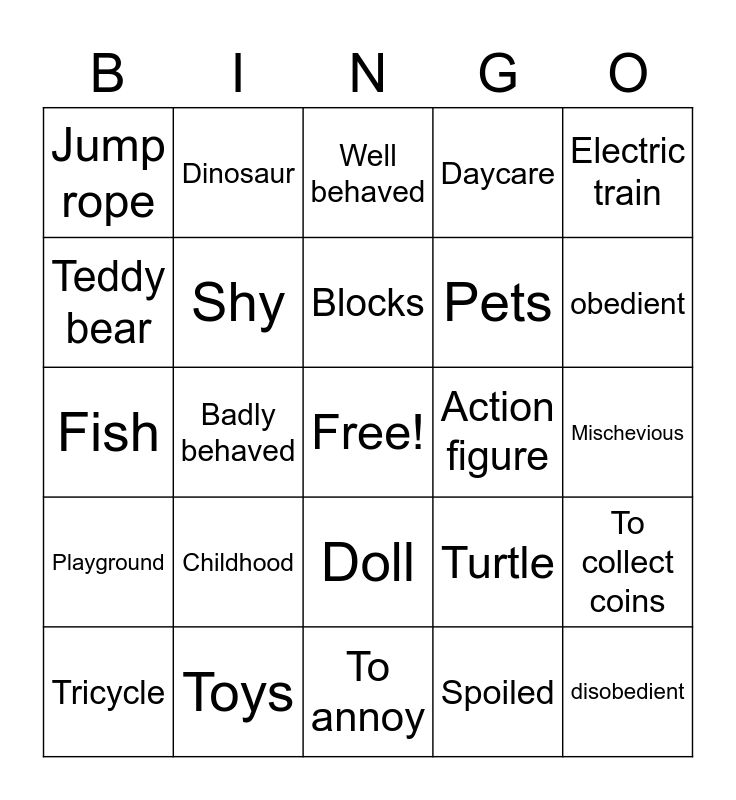 This bingo card has a free space and 24 words: Childhood, Toys, Blocks, Tricycle, Electric train, Jump rope, Teddy bear, Dinosaur, Action figure, Doll, Pets, Fish, Turtle, To collect coins, Shy, Spoiled, Mischevious, Well behaved, obedient, Badly behaved, disobedient, Playground, Daycare and To annoy.