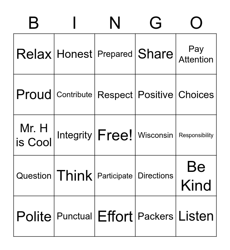 This bingo card has a free space and 24 words: Think, Punctual, Respect, Polite, Pay Attention, Relax, Proud, Honest, Wisconsin, Participate, Positive, Mr. H is Cool, Directions, Be Kind, Contribute, Packers, Responsibility, Prepared, Choices, Integrity, Listen, Question, Share and Effort.