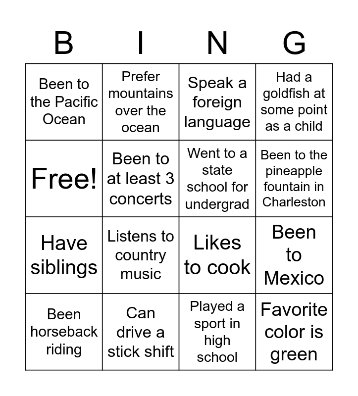 This bingo card has 16 words: Can drive a stick shift, Been to Mexico, Speak a foreign language, Been to the Pacific Ocean, Have siblings, Prefer mountains over the ocean, Likes to cook, Played a sport in high school, Free!, Been to at least 3 concerts, Been horseback riding, Had a goldfish at some point as a child, Listens to country music, Been to the pineapple fountain in Charleston, Went to a state school for undergrad and Favorite color is green.