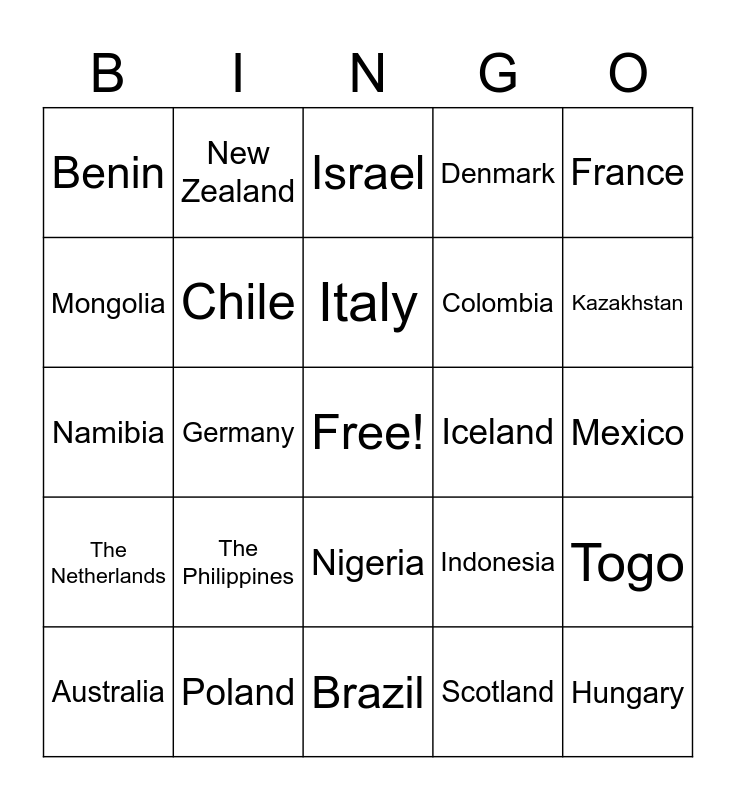This bingo card has a free space and 57 words: Argentina, Australia, The Bahamas, Benin, Brazil, Bulgaria, Chile, China, Colombia, Dem. Rep. of Congo, Denmark, Ecuador, Egypt, Estonia, Ethiopia, Finland, France, Germany, Ghana, Hungary, Iceland, India, Indonesia, Israel, Ireland, Italy, Jamaica, Japan, Kazakhstan, Kenya, Lithuania, Madagascar, Malaysia, Mauritania, Mexico, Mongolia, Morocco, Namibia, Nepal, The Netherlands, New Zealand, Nigeria, Norway, Pakistan, Papua New Guinea, Peru, The Philippines, Poland, Portugal, Romania, Russia, Scotland, South Korea, Spain, Sweden, Togo and Trinidad & Tobago.