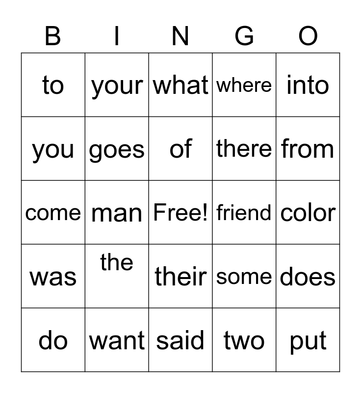This bingo card has a free space and 25 words: the, said, of, do, into, to, you, your, friend, their, there, come, some, does, goes, been, color, what, from, man, put, want, was, where and two.