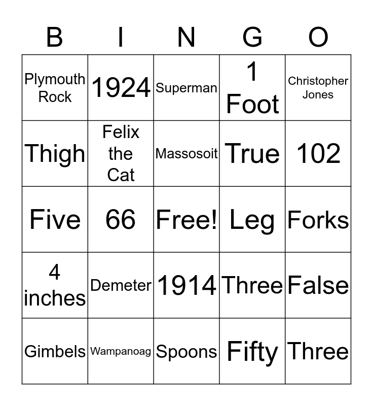 This bingo card has a free space and 24 words: Demeter, Wampanoag, Massosoit, Gimbels, Christopher Jones, Plymouth Rock, Thigh, 1924, Leg, 1914, True, Five, Three, False, Felix the Cat, Fifty, Forks, Superman, 102, 66, Three, 4 inches, 1 Foot and Spoons.