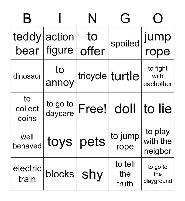 This bingo card has a free space and 24 words: toys, blocks, tricycle, electric train, jump rope, teddy bear, dinosaur, action figure, doll, pets, turtle, to collect coins, to jump rope, to play with the neigbor, to annoy, to tell the truth, to lie, to offer, to fight with eachother, to go to daycare, to go to the playground, well behaved, spoiled and shy.