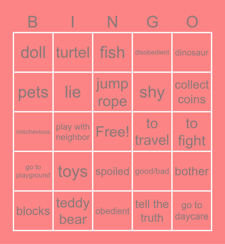 This bingo card has a free space and 24 words: toys, teddy bear, jump rope, blocks, dinosaur, doll, pets, turtel, to travel, spoiled, shy, mischevious, good/bad, bother, lie, tell the truth, to fight, fish, collect coins, play with neighbor, go to daycare, go to playground, disobedient and obedient.