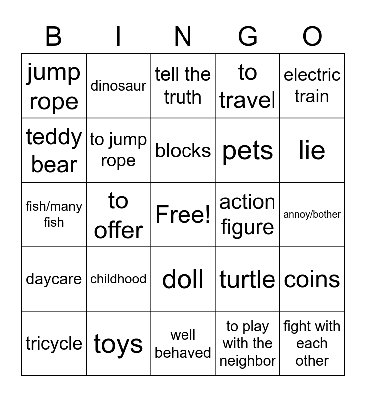 This bingo card has a free space and 24 words: childhood, toys, blocks, tricycle, electric train, jump rope, teddy bear, dinosaur, action figure, doll, pets, fish/many fish, turtle, coins, to jump rope, to play with the neighbor, annoy/bother, tell the truth, lie, to offer, fight with each other, daycare, to travel and well behaved.
