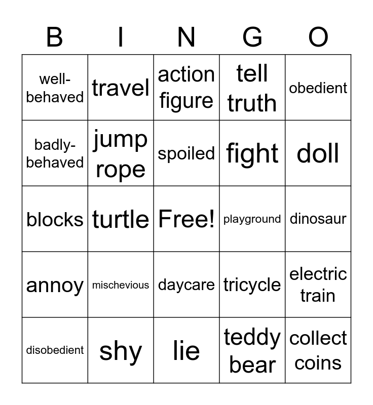 This bingo card has a free space and 24 words: mischevious, shy, spoiled, disobedient, obedient, well-behaved, badly-behaved, travel, playground, daycare, fight, blocks, tricycle, electric train, jump rope, teddy bear, dinosaur, action figure, doll, turtle, collect coins, annoy, tell truth and lie.