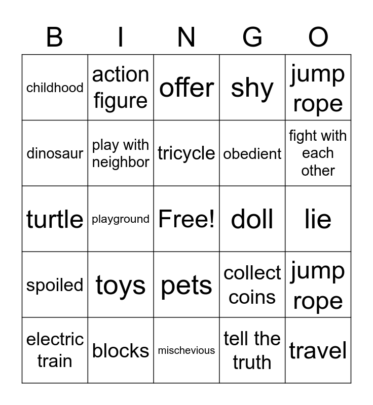 This bingo card has a free space and 24 words: toys, blocks, tricycle, electric train, jump rope, childhood, dinosaur, action figure, doll, pets, obedient, turtle, collect coins, jump rope, play with neighbor, tell the truth, lie, offer, fight with each other, playground, travel, spoiled, shy and mischevious.