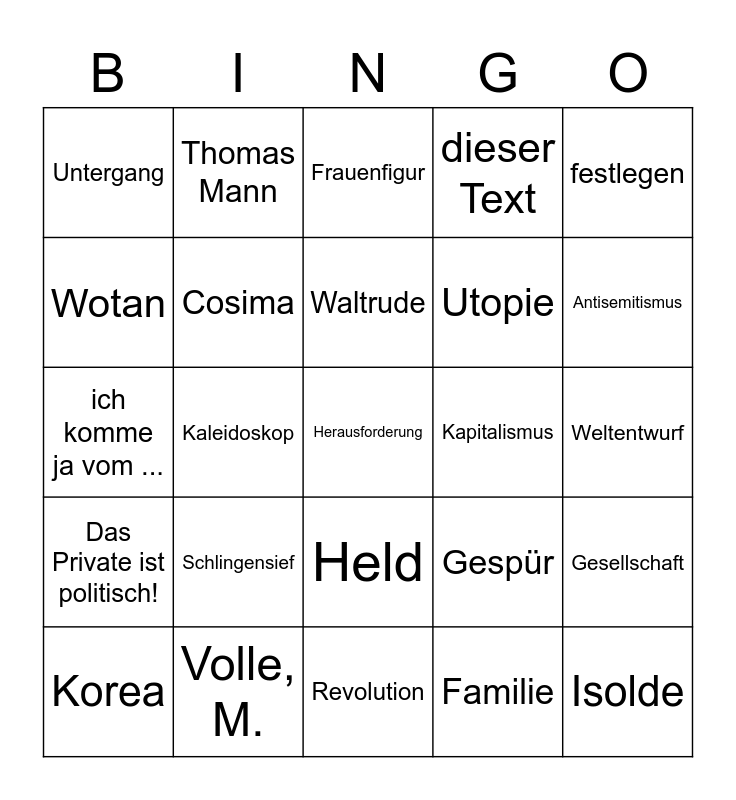 This bingo card has 26 words: Held, Familie, Waltrude, Volle, M., festlegen, Untergang, Wotan, Thomas Mann, Weltentwurf, Gespür, Utopie, ich komme ja vom ..., Gesellschaft, Korea, Kaleidoskop, entwickeln, dieser Text, Das Private ist politisch!, Frauenfigur, Herausforderung, Antisemitismus, Revolution, Kapitalismus, Schlingensief, Cosima and Isolde.