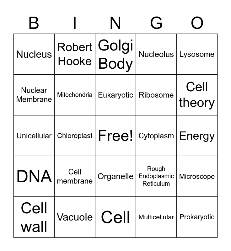 This bingo card has a free space and 24 words: Cell membrane, Vacuole, Eukaryotic, Cell wall, Lysosome, Nucleus, Nuclear Membrane, Robert Hooke, Cytoplasm, Organelle, Ribosome, Unicellular, Rough Endoplasmic Reticulum, Microscope, Mitochondria, Multicellular, Energy, Golgi Body, Cell theory, Chloroplast, Prokaryotic, DNA, Nucleolus and Cell.