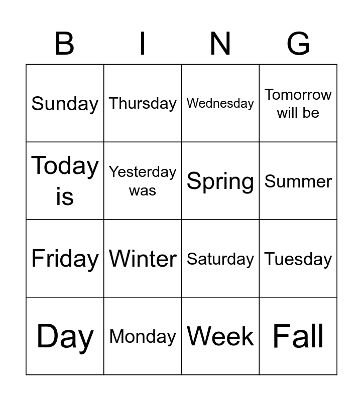 This bingo card has 16 words: Monday, Tuesday, Wednesday, Sunday, Friday, Thursday, Saturday, Week, Today is, Yesterday was, Day, Tomorrow will be, Winter, Summer, Spring and Fall.