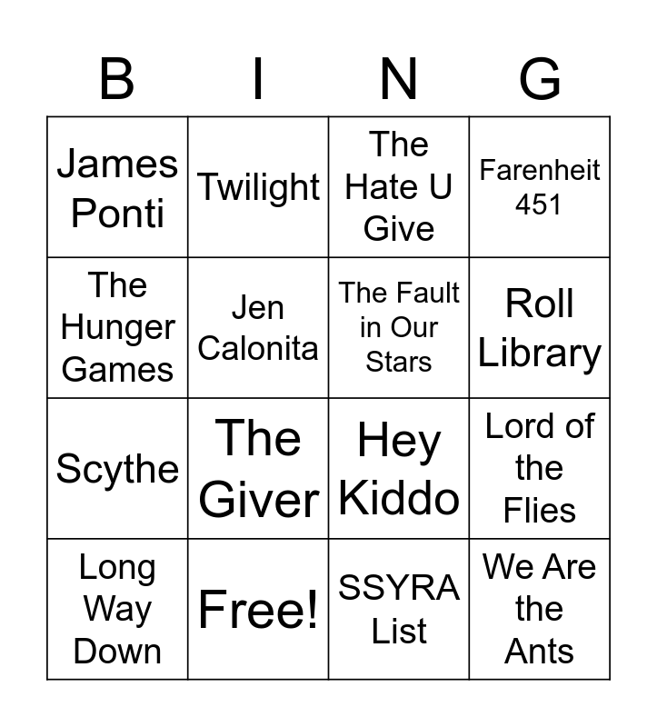 This bingo card has 24 words: Harry Potter, Calkins Library, Roll Library, Snow Library, The Hunger Games, James Ponti, Jen Calonita, Twilight, Free!, The Lightning Thief, Scythe, Hey Kiddo, Jarrett Krosoczka, The Hobbit, The Fault in Our Stars, Dear Martin, SSYRA List, The Hate U Give, The Giver, Lord of the Flies, Long Way Down, We Are the Ants, Farenheit 451 and Legend.