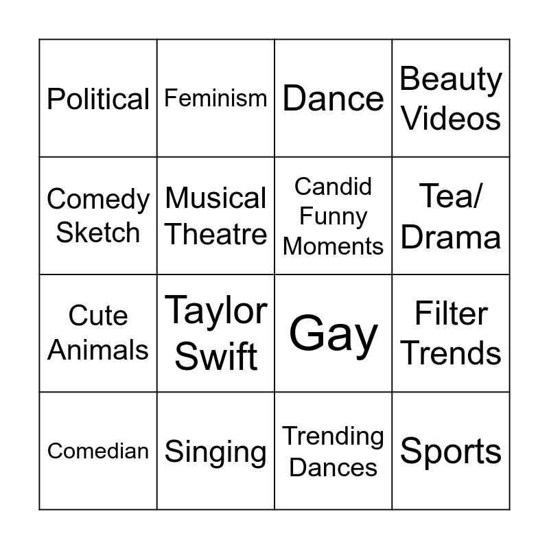 This bingo card has 16 words: Singing, Filter Trends, Dance, Political, Cute Animals, Feminism, Gay, Trending Dances, Comedy Sketch, Musical Theatre, Comedian, Beauty Videos, Taylor Swift, Tea/ Drama, Candid Funny Moments and Sports.