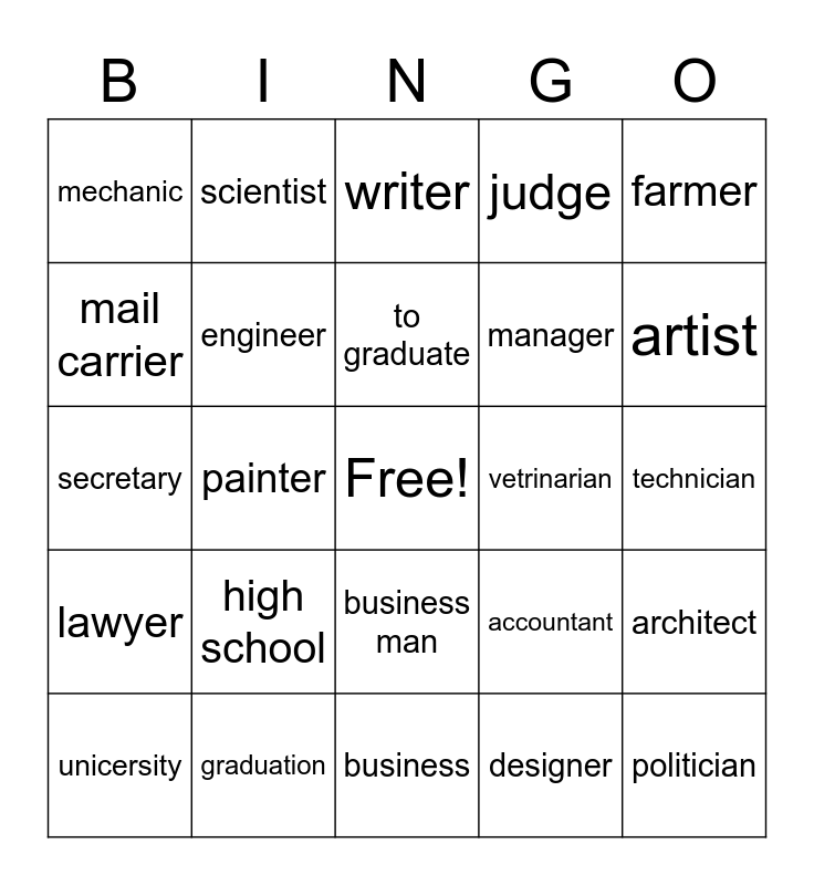 This bingo card has a free space and 24 words: high school, graduation, to graduate, unicersity, farmer, mechanic, mail carrier, scientist, vetrinarian, business man, manager, secretary, accountant, architect, engineer, designer, technician, writer, artist, painter, politician, lawyer, judge and business.