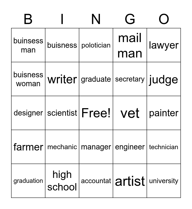 This bingo card has a free space and 24 words: mechanic, high school, graduate, graduation, lawyer, buinsess man, buisness woman, buisness, vet, manager, secretary, designer, engineer, technician, writer, artist, painter, polotician, judge, scientist, university, farmer, mail man and accountat.