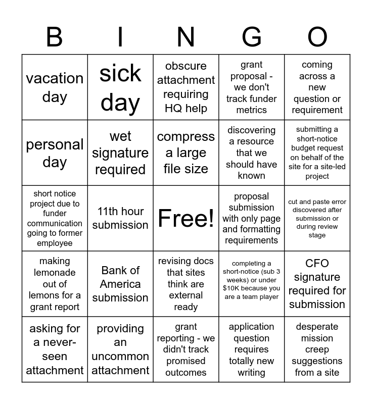 This bingo card has a free space and 24 words: Bank of America submission, providing an uncommon attachment, compress a large file size, asking for a never-seen attachment, coming across a new question or requirement, vacation day, personal day, sick day, proposal submission with only page and formatting requirements, revising docs that sites think are external ready, discovering a resource that we should have known, short notice project due to funder communication going to former employee, completing a short-notice (sub 3 weeks) or under $10K because you are a team player, CFO signature required for submission, wet signature required, application question requires totally new writing, cut and paste error discovered after submission or during review stage, obscure attachment requiring HQ help, submitting a short-notice budget request on behalf of the site for a site-led project, 11th hour submission, desperate mission creep suggestions from a site, making lemonade out of lemons for a grant report, grant proposal - we don't track funder metrics and grant reporting - we didn't track promised outcomes.