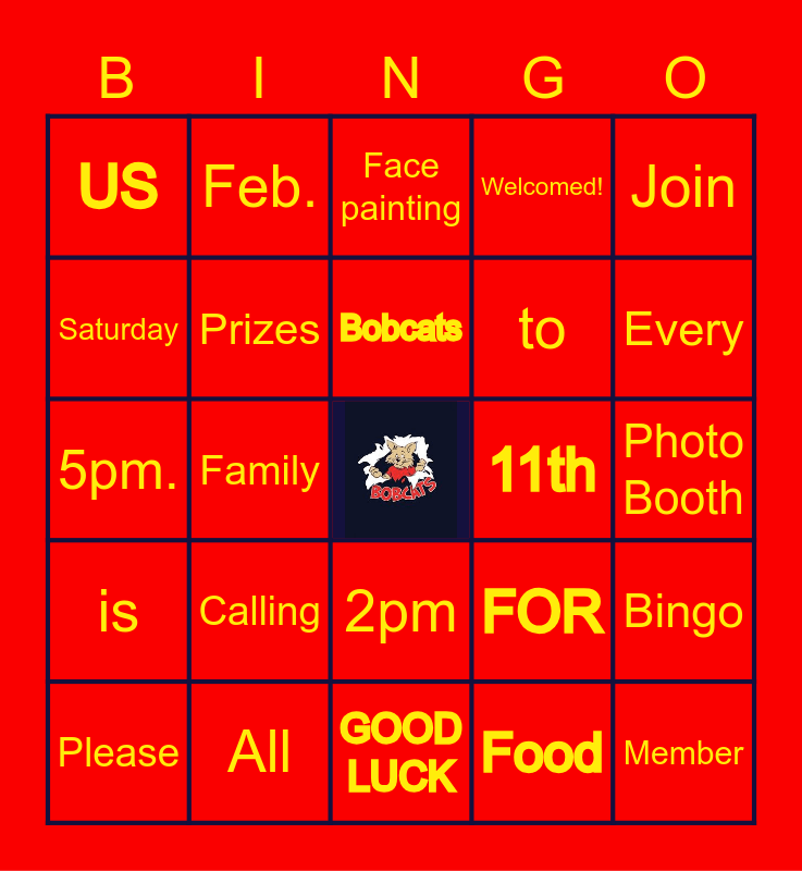 This bingo card has a free space and 24 words: Calling, All, Bobcats, Please, Join, US, Saturday, Feb., 11th, 2pm, to, 5pm., FOR, Bingo, Prizes, Food, Photo Booth, Face painting, Every, Family, Member, is, Welcomed! and GOOD LUCK.
