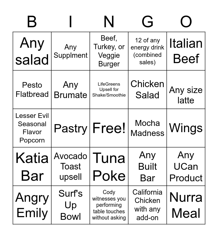 This bingo card has a free space and 24 words: Avocado Toast upsell, Surf's Up Bowl, LifeGreens Upsell for Shake/Smoothie, Angry Emily, Italian Beef, Any salad, Pesto Flatbread, Any Supplment, Mocha Madness, Tuna Poke, Chicken Salad, Lesser Evil Seasonal Flavor Popcorn, Any Built Bar, Any UCan Product, Any Brumate, California Chicken with any add-on, Wings, Beef, Turkey, or Veggie Burger, Any size latte, Pastry, Nurra Meal, Katia Bar, 12 of any energy drink (combined sales) and Cody witnesses you performing table touches without asking.