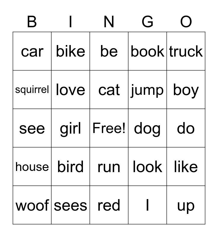 This bingo card has a free space and 24 words: bird, sees, cat, woof, truck, car, squirrel, bike, dog, run, jump, see, look, like, love, I, do, be, boy, girl, up, house, book and red.