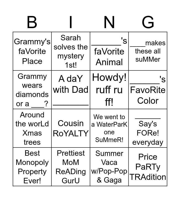 This bingo card has a free space and 15 words: Best Monopoly Property Ever!, Price PaRTy TRAdition, ______'s faVorite Animal, Grammy's faVorite Place, ______'s FavoRite Color, Grammy wears diamonds or a ___?, Cousin RoYALTY, Summer Vaca w/Pop-Pop & Gaga, A daY with Dad _______, Around the worLd Xmas trees, ______ Say's FORe! everyday, ____makes these all suMMer, Howdy! ruff ruff!, Sarah solves the mystery 1st! and Prettiest MoM ReADing GurU.