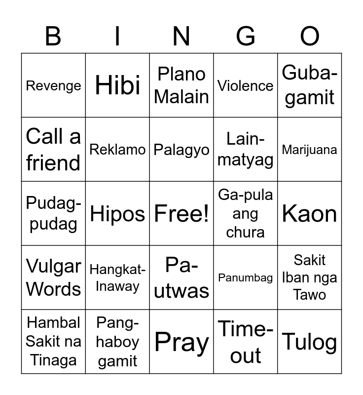 This bingo card has a free space and 36 words: Inom, Ga-init ang lawas, Tulok Malain, Reklamo, Panumbag, Vulgar Words, Palagyo, Pagsingit, Guba-gamit, Libak, Hipos, Violence, Shabu, Ga-pula ang chura, Marijuana, Revenge, Panipa, Hangkat-Inaway, Tulog, Plano Malain, Kaon, Sakit Iban nga Tawo, Pang-haboy gamit, Hambal Sakit na Tinaga, Pray, Hibi, Pudag-pudag, Bais, Lain-matyag, Call a friend, Trabaho, Taas dugo, Time-out, Pa-utwas, Tampo and Kumod Kumod.