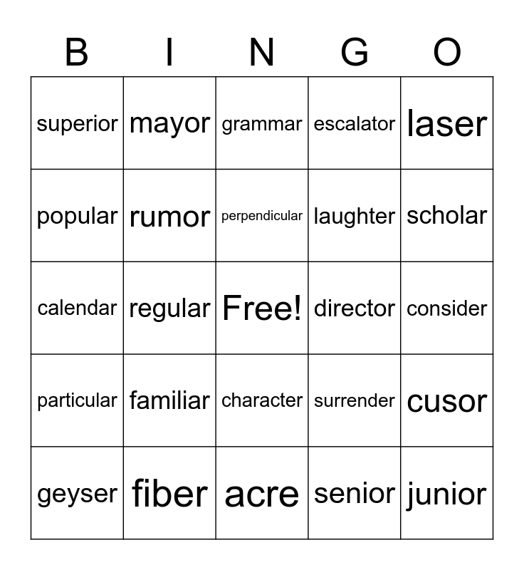 This bingo card has a free space and 30 words: fiber, similar, regular, barrier, superior, grammar, rumor, character, director, acre, consider, junior, senior, solar, scholar, razor, surrender, particular, familiar, laser, calendar, weather, mayor, laughter, popular, escalator, cusor, geyser, perpendicular and maneuver.