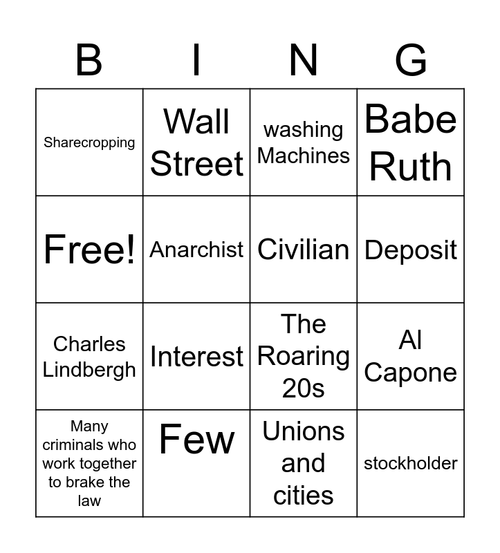 This bingo card has 16 words: Few, Al Capone, washing Machines, Sharecropping, Charles Lindbergh, Wall Street, The Roaring 20s, Unions and cities, Free!, Anarchist, Many criminals who work together to brake the law, Babe Ruth, Interest, Deposit, Civilian and stockholder.