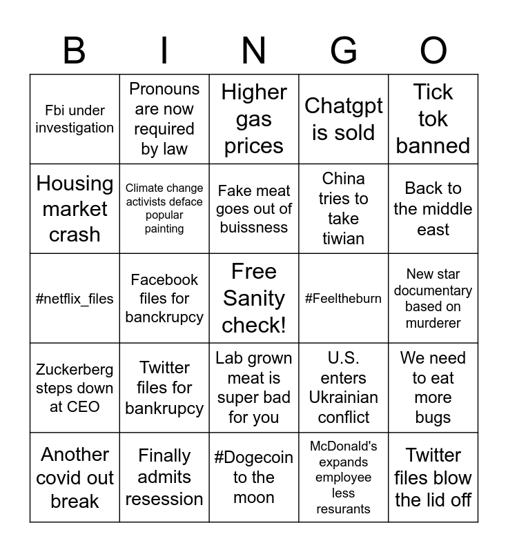 This bingo card has a free space and 24 words: Twitter files for bankrupcy, Finally admits resession, Fake meat goes out of buissness, Another covid out break, Tick tok banned, Fbi under investigation, Housing market crash, Pronouns are now required by law, #Feeltheburn, Lab grown meat is super bad for you, China tries to take tiwian, #netflix_files, U.S. enters Ukrainian conflict, We need to eat more bugs, Climate change activists deface popular painting, McDonald's expands employee less resurants, New star documentary based on murderer, Higher gas prices, Back to the middle east, Facebook files for banckrupcy, Twitter files blow the lid off, Zuckerberg steps down at CEO, Chatgpt is sold and #Dogecoin to the moon.