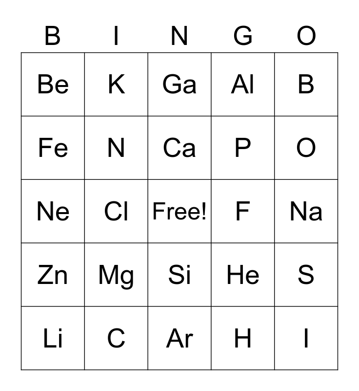 This bingo card has a free space and 24 words: Li, Mg, Ca, H, B, Be, K, Ga, F, Na, Ne, N, He, S, Fe, C, Ar, Al, O, Zn, Cl, Si, P and I.