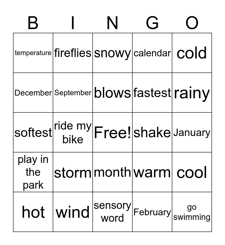 This bingo card has a free space and 24 words: storm, wind, blows, hot, cold, temperature, December, fireflies, shake, month, fastest, softest, warm, cool, September, February, January, snowy, rainy, ride my bike, go swimming, play in the park, calendar and sensory word.