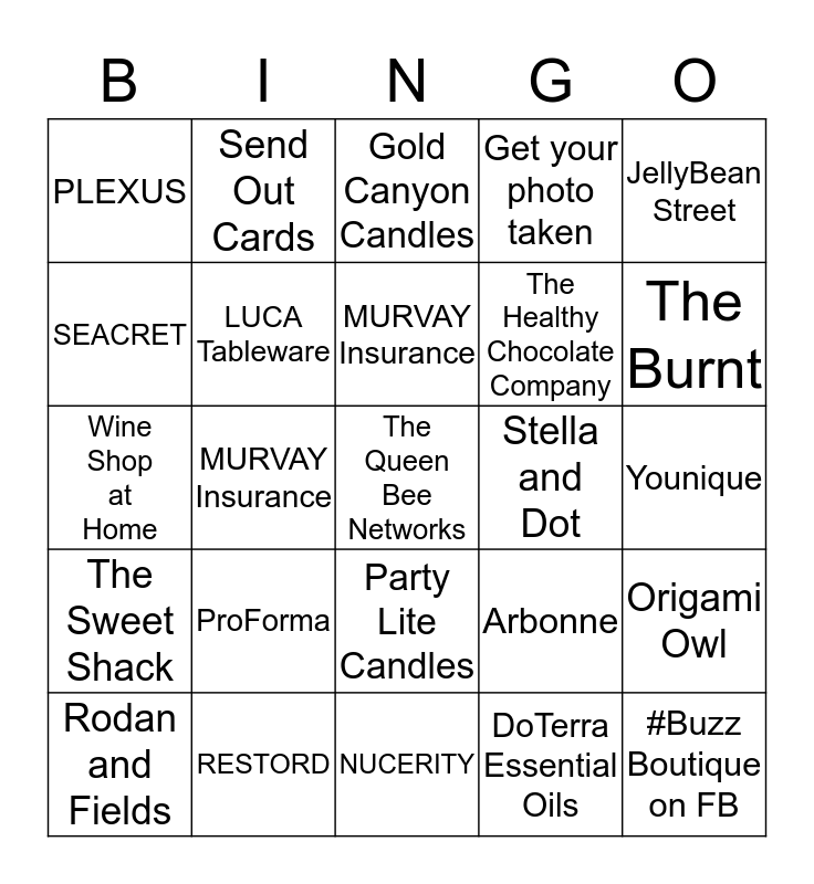 This bingo card has a free space and 24 words: ProForma, RESTORD, MURVAY Insurance, Rodan and Fields, JellyBean Street, PLEXUS, SEACRET, Send Out Cards, Stella and Dot, Party Lite Candles, The Healthy Chocolate Company, Wine Shop at Home, Arbonne, Origami Owl, LUCA Tableware, DoTerra Essential Oils, Younique, Gold Canyon Candles, The Burnt, MURVAY Insurance, #Buzz Boutique on FB, The Sweet Shack, Get your photo taken and NUCERITY.
