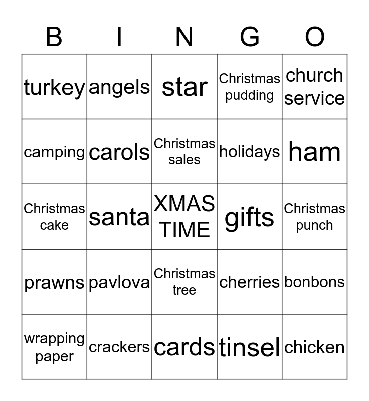 This bingo card has a free space and 30 words: crackers, baubles, santa, reindeer, turkey, star, carols, Christmas tree, gifts, cards, Christmas punch, chicken, tinsel, bells, ham, parties, cherries, prawns, pavlova, church service, Christmas cake, three wise men, angels, holidays, camping, Christmas pudding, bonbons, wrapping paper, Christmas sales and seafood.