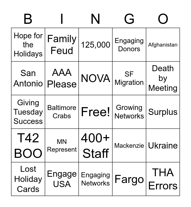 This bingo card has a free space and 24 words: MN Represent, Engage USA, NOVA, Lost Holiday Cards, Afghanistan, Hope for the Holidays, San Antonio, Family Feud, Growing Networks, 400+ Staff, SF Migration, Giving Tuesday Success, Mackenzie, Ukraine, AAA Please, Fargo, Surplus, 125,000, Death by Meeting, Baltimore Crabs, THA Errors, T42 BOO, Engaging Donors and Engaging Networks.