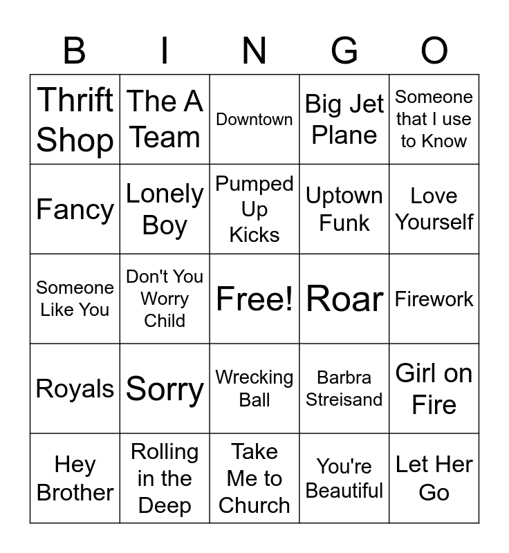 This bingo card has a free space and 41 words: Call Me Maybe, Someone Like You, Hold Back the River, Lonely Boy, Rolling in the Deep, Wrecking Ball, Pumped Up Kicks, We Are Never Getting Back Together, Someone that I use to Know, Royals, Don't You Worry Child, Big Jet Plane, Let Her Go, Firework, Roar, Sorry, I Will Wait, Thrift Shop, Wake Me Up, Downtown, Girl on Fire, Ho Hey, Take Me to Church, Uptown Funk, Party in the USA, Hot n Cold, You're Beautiful, Shake it Off, Love Yourself, Little Talks, Chandelier, The A Team, Hey Brother, Shut Up and Dance, Barbra Streisand, Fancy, Old Town Road, Budapest, Titanium, Shape of You and Party Rock Anthem.