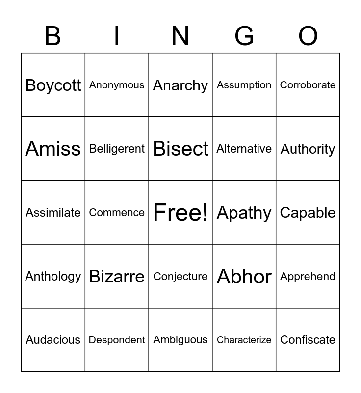 This bingo card has a free space and 27 words: Abhor, Abrasive, Alternative, Ambiguous, Amiss, Anarchy, Anonymous, Anthology, Apathy, Apprehend, Assimilate, Assumption, Audacious, Despondent, Authority, Avid, Belligerent, Bisect, Bizarre, Boycott, Capable, Characterize, Commence, Confiscate, Conjecture, Corroborate and Depict.
