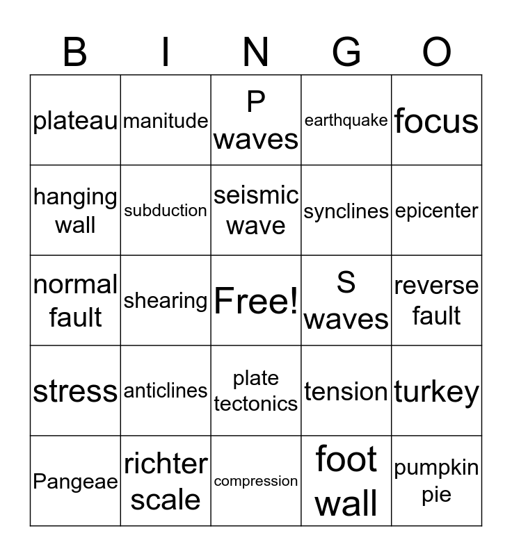 This bingo card has a free space and 24 words: anticlines, richter scale, seismic wave, Pangeae, focus, plateau, hanging wall, manitude, S waves, plate tectonics, synclines, normal fault, tension, turkey, subduction, foot wall, reverse fault, P waves, epicenter, shearing, pumpkin pie, stress, earthquake and compression.