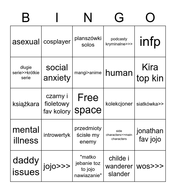 This bingo card has a free space and 24 words: introwertyk, jojo>>>, mangi>anime, daddy issues, infp, asexual, długie serie>>krótkie serie, cosplayer, kolekcjoner, przedmioty ścisłe my enemy, human, książkara, side characters>>main characters, jonathan fav jojo, social anxiety, childe i wanderer slander, siatkówka>>, planszówki solos, Kira top kin, czarny i fioletowy fav kolory, wos>>>, mental illness, podcasty kryminalne>>> and "matko jebanie toz to jojo nawiazanie".