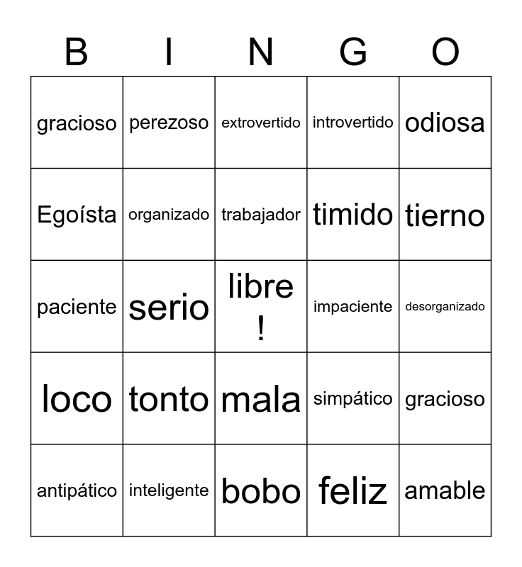 This bingo card has a free space and 24 words: tonto, inteligente, trabajador, antipático, odiosa, gracioso, Egoísta, perezoso, impaciente, mala, timido, paciente, simpático, gracioso, organizado, feliz, desorganizado, extrovertido, tierno, serio, amable, loco, introvertido and bobo.