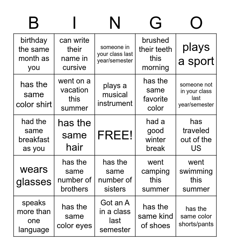 This bingo card has a free space and 24 words: has the same number of brothers, has the same color eyes, plays a musical instrument, speaks more than one language, plays a sport, birthday the same month as you, has the same color shirt, can write their name in cursive, had a good winter break, has the same number of sisters, has the same favorite color, had the same breakfast as you, went camping this summer, went swimming this summer, went on a vacation this summer, has the same kind of shoes, has traveled out of the US, someone in your class last year/semester, someone not in your class last year/semester, has the same hair, has the same color shorts/pants, wears glasses, brushed their teeth this morning and Got an A in a class last semester.