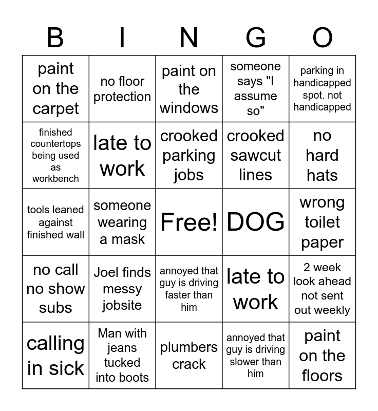 This bingo card has a free space and 24 words: Joel finds messy jobsite, Man with jeans tucked into boots, crooked parking jobs, calling in sick, parking in handicapped spot. not handicapped, paint on the carpet, finished countertops being used as workbench, no floor protection, DOG, annoyed that guy is driving faster than him, crooked sawcut lines, tools leaned against finished wall, late to work, 2 week look ahead not sent out weekly, late to work, annoyed that guy is driving slower than him, wrong toilet paper, paint on the windows, no hard hats, someone wearing a mask, paint on the floors, no call no show subs, someone says "I assume so" and plumbers crack.