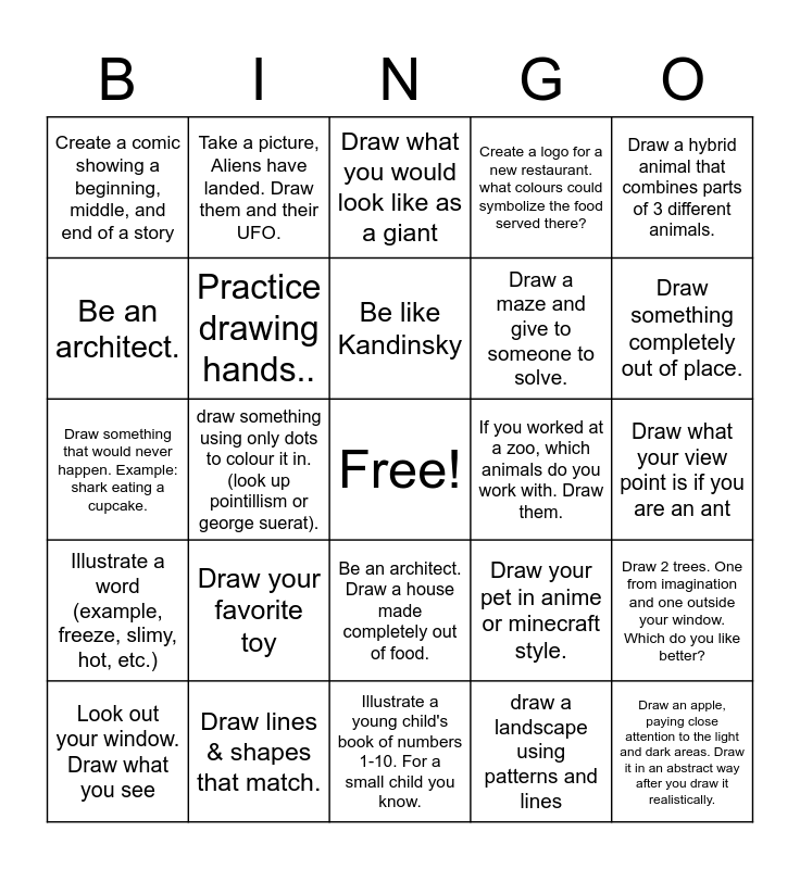 This bingo card has a free space and 24 words: Draw your favorite toy, Draw lines & shapes that match., Be like Kandinsky, Look out your window. Draw what you see, Draw a hybrid animal that combines parts of 3 different animals., Create a comic showing a beginning, middle, and end of a story, Be an architect., Take a picture, Aliens have landed. Draw them and their UFO., If you worked at a zoo, which animals do you work with. Draw them., Be an architect. Draw a house made completely out of food., Draw a maze and give to someone to solve., Draw something that would never happen. Example: shark eating a cupcake., Draw your pet in anime or minecraft style., Draw 2 trees. One from imagination and one outside your window. Which do you like better?, Practice drawing hands.., draw a landscape using patterns and lines, Draw what your view point is if you are an ant, Draw what you would look like as a giant, Draw something completely out of place., draw something using only dots to colour it in. (look up pointillism or george suerat)., Draw an apple, paying close attention to the light and dark areas. Draw it in an abstract way after you draw it realistically., Illustrate a word (example, freeze, slimy, hot, etc.), Create a logo for a new restaurant. what colours could symbolize the food served there? and Illustrate a young child's book of numbers 1-10. For a small child you know..