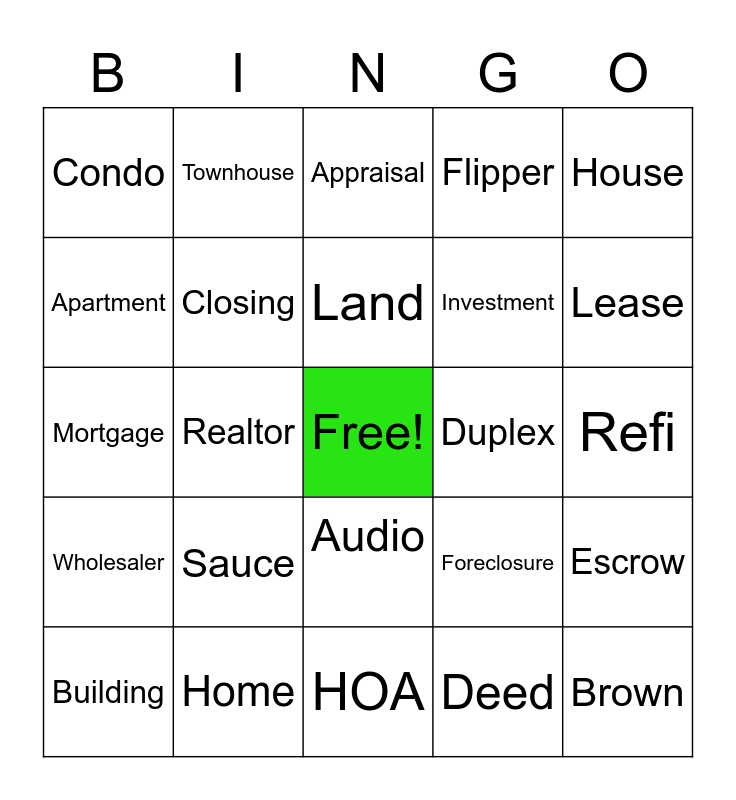 This bingo card has a free space and 24 words: Sauce, Home, Land, Building, House, Condo, Apartment, Townhouse, Duplex, Audio, Investment, Mortgage, Foreclosure, Escrow, Closing, Deed, Refi, Appraisal, Lease, Realtor, Brown, Wholesaler, Flipper and HOA.