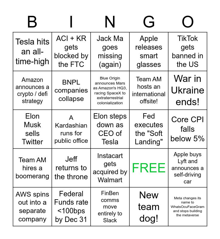 This bingo card has 25 words: Jeff returns to the throne, FinBen comms move entirely to Slack, Blue Origin announces Mars as Amazon's HQ3, racing SpaceX to extraterrestrial colonialization, AWS spins out into a separate company, TikTok gets banned in the US, Tesla hits an all-time-high, Amazon announces a crypto / defi strategy, ACI + KR gets blocked by the FTC, Fed executes the "Soft Landing", Instacart gets acquired by Walmart, Team AM hosts an international offsite!, Elon Musk sells Twitter, FREE, Apple buys Lyft and announces a self-driving car, BNPL companies collapse, Meta changes its name to WhatsOcuFaceGram and stops building the metaverse, Core CPI falls below 5%, Jack Ma goes missing (again), War in Ukraine ends!, A Kardashian runs for public office, Elon steps down as CEO of Tesla, Federal Funds rate <100bps by Dec 31, Team AM hires a boomerang, Apple releases smart glasses and New team dog!.