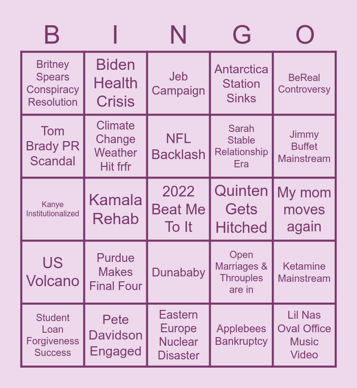 This bingo card has a free space and 24 words: Purdue Makes Final Four, Pete Davidson Engaged, NFL Backlash, Student Loan Forgiveness Success, BeReal Controversy, Britney Spears Conspiracy Resolution, Tom Brady PR Scandal, Biden Health Crisis, Quinten Gets Hitched, Dunababy, Sarah Stable Relationship Era, Kanye Institutionalized, Open Marriages & Throuples are in, Ketamine Mainstream, Climate Change Weather Hit frfr, Applebees Bankruptcy, My mom moves again, Jeb Campaign, Jimmy Buffet Mainstream, Kamala Rehab, Lil Nas Oval Office Music Video, US Volcano, Antarctica Station Sinks and Eastern Europe Nuclear Disaster.