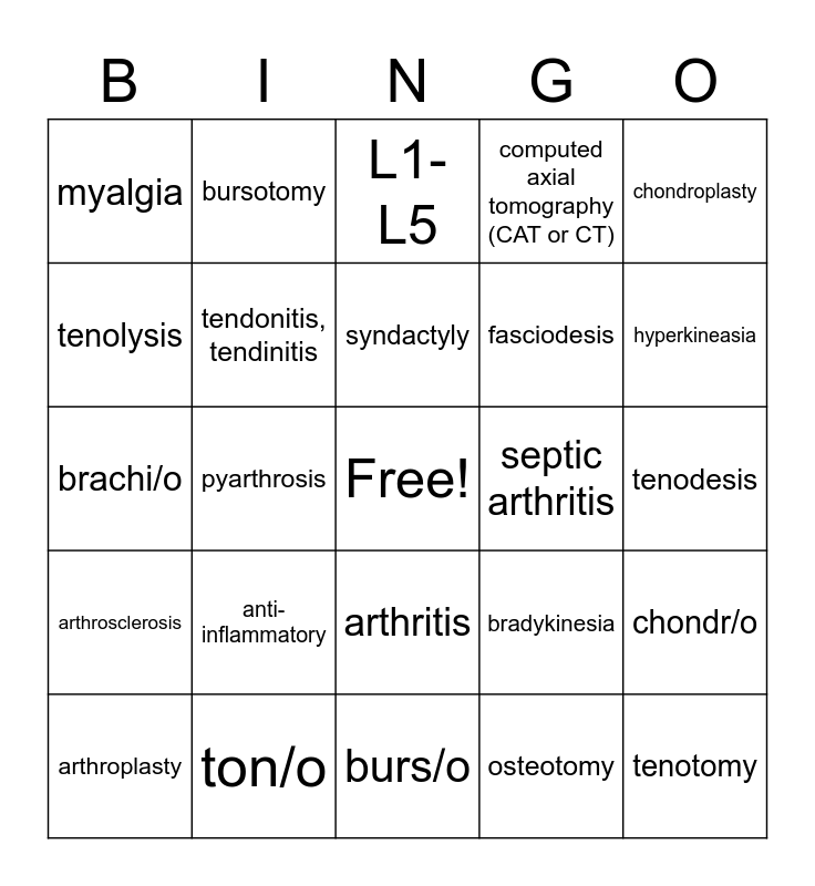 This bingo card has a free space and 212 words: Hx, Fx, Tx, ACL, MCL, LCL, PCL, C1-C7, T1-T12, L1-L5, DTR, EMG, FROM, NSAID, OA, ORIF, PT, RA, RICE, ROM, WB, WBAT, ankyl/o, arthr/o, brachi/o, burs/o, carp/o, cervic/o, chondr/o, cost/o, crani/o, dactyl/o, fasci/o, femor/o, kinesi/o, lumb/o, muscul/o, my/o, myos/o, oste/o, -physis, spondyl/o, tars/o, tax/o, ten/o, tend/o, tendin/o, tibi/o, ton/o, Anchondroplasia, analgesic, ankylosing spondylitis, ankylosis, antiarthritic, anti-inflammatory, antipyretic, arthrodysplasia, arthralgia, arthritis, arthrocele, arthrocentesis, arthroclasia, arthrodesis, arthrodynia, arthrectomy, arthrogram, arthrography, arthrolysis, arthroplasty, arthropathy, arthrosclerosis, arthroscope, arthroscopy, arthrotomy, atrophy, bradykinesia, bursectomy, Bursitis, bursolith, bursopathy, bursotomy, carpectomy, carpitis, cervicodynia, chondrectomy, chondroma, chondromalacia, chondro-osteodystrophy, chondroplasty, Closed Reduction, computed axial tomography (CAT or CT), costalgia, costectomy, costochondritis, craniectomy, craniomalacia, Craniosynostosis, craniotomy, crepitation, dactylitis, dyskinesia, dystaxia, Dystonia, effusion, electromyogram, electromyography, exostosis, external fixation, fasciectomy, fascitis, fasciodesis, fascioplasty, fasciorrhaphy, fasciotomy, fracture, genu valgum, genu varum, graphospasm, hemarthrosis, hydrarthrosis, hyperkineasia, hypertonia, hypertrophy, hypertrophic spondylitis, hypertrophy, hypokinesia, hypotonia, internal fixation, kyphosis, lordosis, metacarpectomy, metatarsalgia, muscular dystrophy, myalgia, myasthenia, myectomy, myocele, myoclonus, myodesis, myodynia, myofasciitis, myography, myolysis, myoma, myomalacia, myomectomy, myopathy, myoplasty, myorrhaphy, myosarcoma, myosclerosis, myositis, myospasm, myotasis, myotomy, myotonia, necrotizing fasciitis, open reduciton, orthotics, ostalgia, ostealgia, ostectomy, osteectomy, osteitis, Osteoarthritis, osteocarcinoma, osteochondritis, osteochondroma, osteodynia, osteodystrophy, osteogenesis imperfecta, osteolysis, osteomalacia, Osteomyelitis, osteonecrosis, osteopathy, osteopenia, osteoplasty, Osteoporosis, Osteosarcoma, osteosclerosis, osteotomy, Polydactyly, polymyositis, prosthesis, pyarthrosis, rheumatoid arthritis, Scoliosis, septic arthritis, spinal stenosis, spondylitis, spondyloarthropathy, spondylolisthesis, Spondylolysis, spondylomalacia, spondylonia, spondylosis, spondylosyndesis, sternotomy, subluxation, syndactyly, tardive dyskinesia, tarsectomy, tarsoclasia, tarsoptosis, tenalgia, tendectomy, tendonitis, tendinitis, tendoplasty, tenodesis, tenolysis, tenonectomy, tenoplasty, tenorrhaphy, tenotomy and tibialgia.