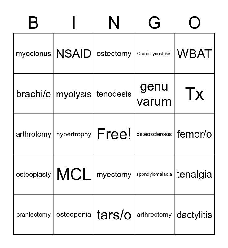 This bingo card has a free space and 211 words: myositis, myospasm, myotasis, myotomy, myotonia, necrotizing fasciitis, open reduciton, orthotics, ostalgia, ostealgia, ostectomy, osteectomy, osteitis, Osteoarthritis, osteocarcinoma, osteochondritis, osteochondroma, osteodynia, osteodystrophy, osteogenesis imperfecta, osteolysis, osteomalacia, Osteomyelitis, osteonecrosis, osteopathy, osteopenia, osteoplasty, Osteoporosis, Osteosarcoma, osteosclerosis, osteotomy, Polydactyly, polymyositis, prosthesis, pyarthrosis, rheumatoid arthritis, Scoliosis, septic arthritis, spinal stenosis, spondylitis, spondyloarthropathy, spondylolisthesis, Spondylolysis, spondylomalacia, spondylonia, spondylosis, spondylosyndesis, sternotomy, subluxation, syndactyly, tardive dyskinesia, tarsectomy, tarsoclasia, tarsoptosis, tenalgia, tendectomy, tendonitis, tendinitis, tendoplasty, tenodesis, tenolysis, tenonectomy, tenoplasty, tenorrhaphy, tenotomy, tibialgia, Fx, Tx, ACL, MCL, LCL, PCL, C1-C7, T1-T12, L1-L5, DTR, EMG, FROM, NSAID, OA, ORIF, PT, RA, RICE, ROM, WB, WBAT, ankyl/o, arthr/o, brachi/o, burs/o, carp/o, cervic/o, chondr/o, cost/o, crani/o, dactyl/o, fasci/o, femor/o, kinesi/o, lumb/o, muscul/o, my/o, myos/o, oste/o, -physis, spondyl/o, tars/o, tax/o, ten/o, tend/o, tendin/o, tibi/o, ton/o, Anchondroplasia, analgesic, ankylosing spondylitis, ankylosis, antiarthritic, anti-inflammatory, antipyretic, arthrodysplasia, arthralgia, arthritis, arthrocele, arthrocentesis, arthroclasia, arthrodesis, arthrodynia, arthrectomy, arthrogram, arthrography, arthrolysis, arthroplasty, arthropathy, arthrosclerosis, arthroscope, arthroscopy, arthrotomy, atrophy, bradykinesia, bursectomy, Bursitis, bursolith, bursopathy, bursotomy, carpectomy, carpitis, cervicodynia, chondrectomy, chondroma, chondromalacia, chondro-osteodystrophy, chondroplasty, Closed Reduction, computed axial tomography (CAT or CT), costalgia, costectomy, costochondritis, craniectomy, craniomalacia, Craniosynostosis, craniotomy, crepitation, dactylitis, dyskinesia, dystaxia, Dystonia, effusion, electromyogram, electromyography, exostosis, external fixation, fasciectomy, fascitis, fasciodesis, fascioplasty, fasciorrhaphy, fasciotomy, fracture, genu valgum, genu varum, graphospasm, hemarthrosis, hydrarthrosis, hyperkineasia, hypertonia, hypertrophy, hypertrophic spondylitis, hypertrophy, hypokinesia, hypotonia, internal fixation, kyphosis, lordosis, metacarpectomy, metatarsalgia, muscular dystrophy, myalgia, myasthenia, myectomy, myocele, myoclonus, myodesis, myodynia, myofasciitis, myography, myolysis, myoma, myomalacia, myomectomy, myopathy, myoplasty, myorrhaphy, myosarcoma and myosclerosis.