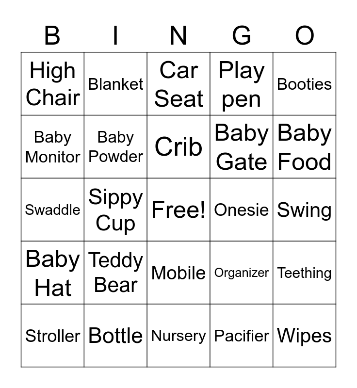 This bingo card has a free space and 27 words: Organizer, Rattle, Baby Gate, Nursery, Baby Monitor, Car Seat, Blanket, Baby Hat, Onesie, Teething, Swaddle, Play pen, Stroller, Bottle, Baby Food, Diaper Bag, Baby Powder, Crib, Teddy Bear, High Chair, Swing, Pacifier, Sippy Cup, Wipes, Mobile, Booties and Bib.
