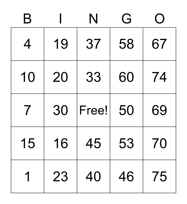 This bingo card has a free space and 24 words: 1, 16, 33, 46, 67, 4, 19, 37, 50, 69, 7, 20, 53, 70, 10, 23, 40, 58, 74, 15, 30, 45, 60 and 75.