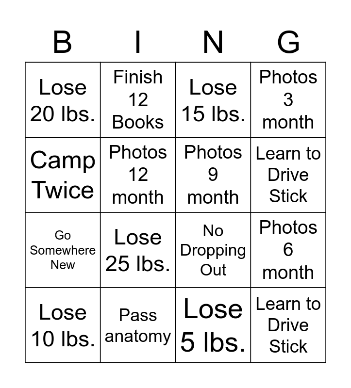 This bingo card has 17 words: Lose 5 lbs., Lose 10 lbs., Lose 15 lbs., Lose 20 lbs., Lose 25 lbs., Photos 3 month, Photos 6 month, Photos 9 month, Learn to Drive Stick, Photos 12 month, Pass anatomy, No Dropping Out, Camp Twice, Finish 12 Books, Go Somewhere New, Get a Job and Learn to Drive Stick.